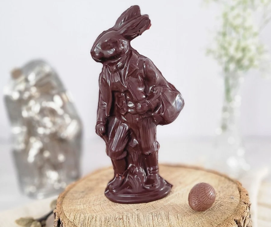 Vous tomberez sous le charme de ce lapin bavarois du 19e siècle, nous rappelant les Pâques d'antan. Fait de chocolat noir 70% végane. Chocolaterie artisanale située à Oka.
