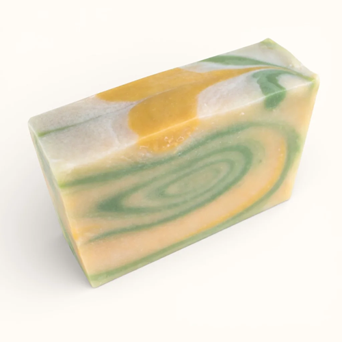 - Ingrédients : Huiles (olive, noix de coco bio, amande douce), eau, hydroxyde de sodium, lait de chèvre, beurre de cacao, huiles essentielles (citronnelle, eucalyptus citronné, géranium et lavande), cire d'abeille du Québec, argile verte et pigments.